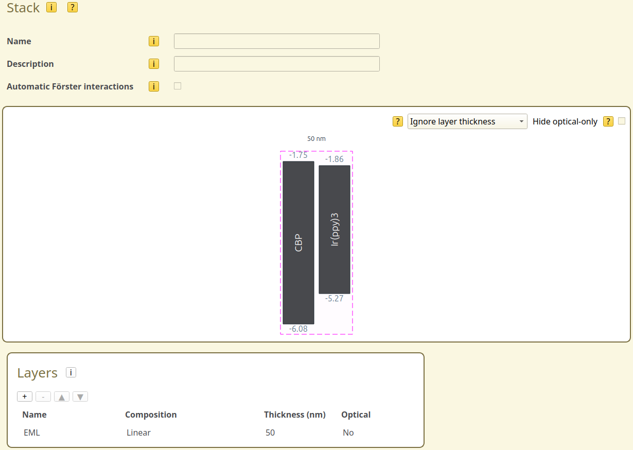 button on the Layers table. This will create our single-layer stack. We update the layer thickness to 50 nm and change the composition to use the Linear gradient created earlier.