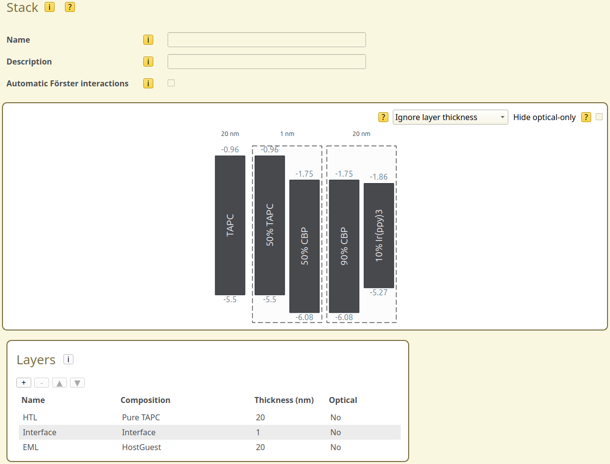 In order to model the microscopic roughness of layer interfaces, a composite layer can be added to the stack in order to describe the nanoscale spatial mixing of the layer components. For this example, we will look at the interface between a TAPC transport layer and an emissive layer containing a CBP/Ir(ppy)3 host/guest mixture.