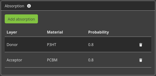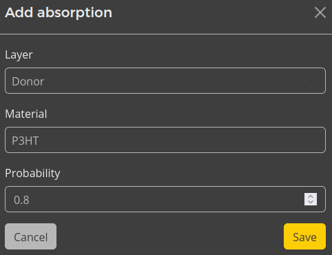 Photo-absorption processes can be added in the stack editor. Select the Add Absorption option to define a new absorption process. We select the P3HT material in the donor layer. Absorption is described as a fixed excitation probability per incident photon. We will assume a factor of 0.8, accounting for optical loss processes. Use the Save button to commit this process to the stack. Then repeat these steps to add the same reaction to the PCBM material in the acceptor layer.