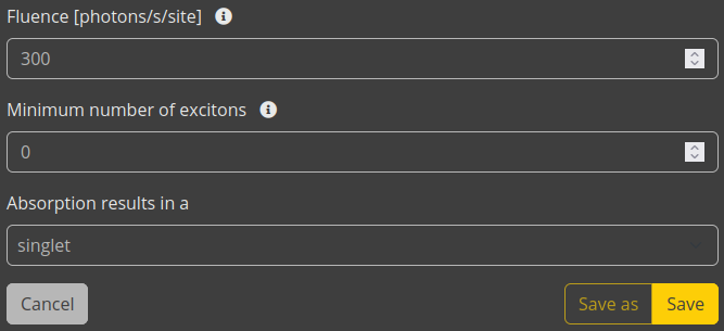 We set a HOMO level of -5.2 eV and a LUMO level of -3.3 eV. For the excitons, we use a singlet binding energy of 1.2 eV and a triplet binding energy of 1.4 eV. Default Gaussian broadening is used for both polaron and exciton energy levels. The Dexter prefactor for excitonic transfer is set to 1.9.