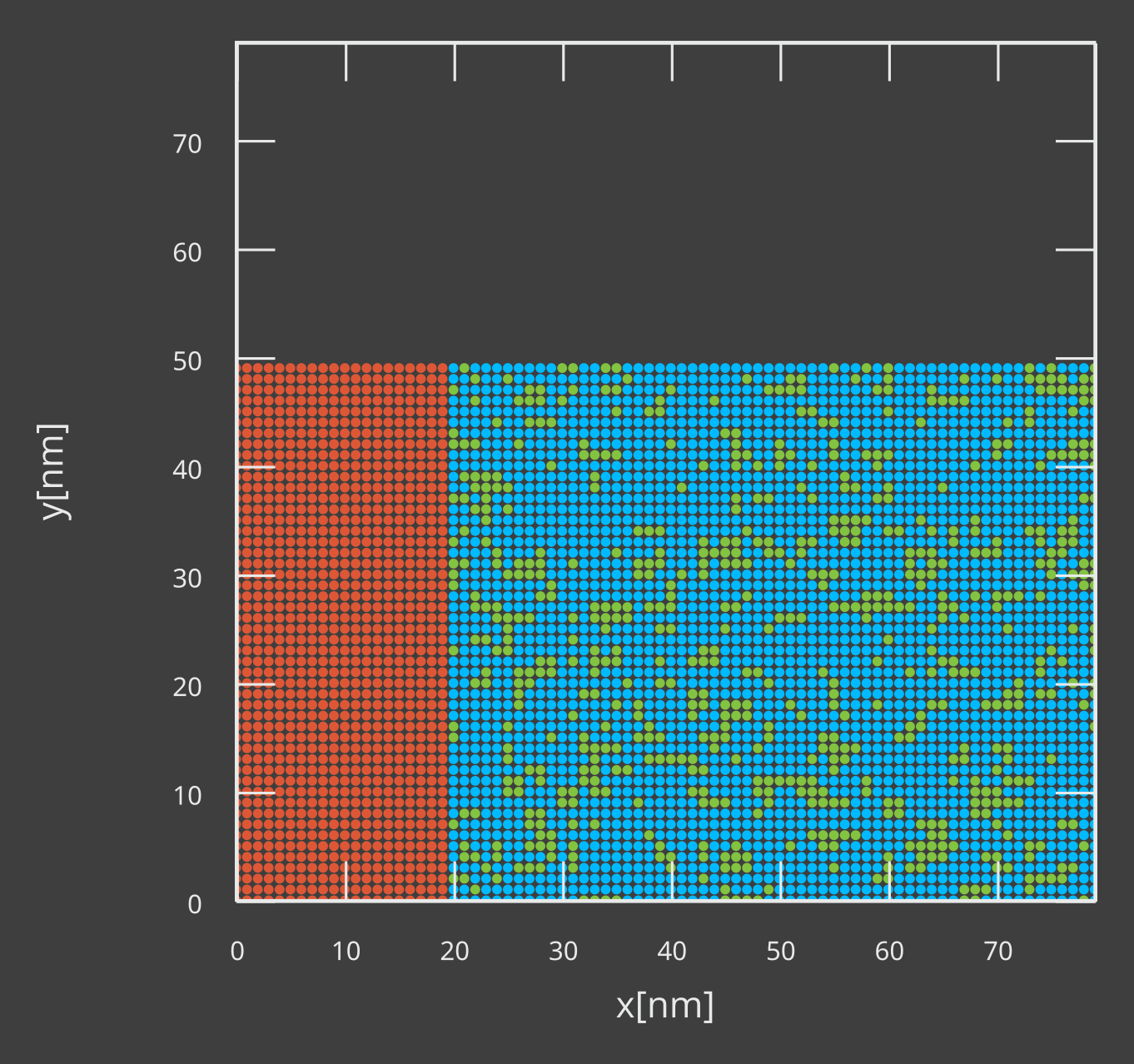 A polymer fraction is specified to determine the portion of the grid that will be filled with the polymeric material. The maximum size of the individual chains is set using the chain length parameter. Note that not every polymer will be able to reach the maximum chain length, either due to confinement by neighboring chains or the finite size of the layer.
