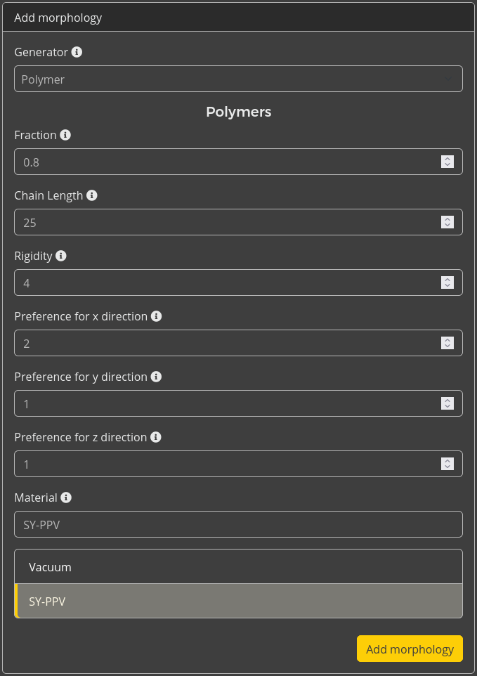 We use the polymer generator to create a polymeric morphology. This generator will attempt to fill the layer using polymeric chains obtained through a self-avoiding walk.