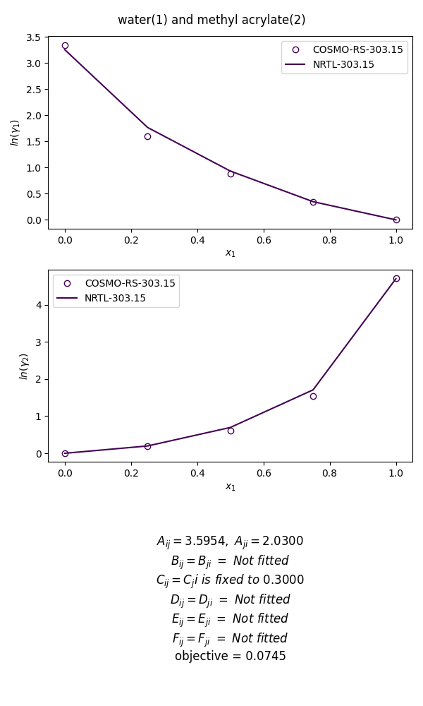 The figure below illustrate the regression for the mixture of water and methyl acrylate at 303K, using a fixed value of non-randomness factor at 0.3. The optimal interaction parameter obtained are 3.595 and 2.030, which are close to the value of 3.464 and 3.563 derived from experimental data regression reported in the literature [1].