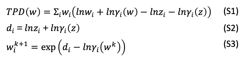 The TPD function (Eq. S1) is evaluated for trial compositions \(w\) relative to the feed composition \(z\). For convenience, \(d_i\) is defined as in Eq. S2.