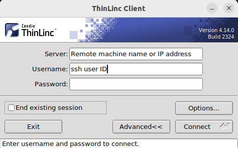 Once the client is installed, you can connect to the remote machine using the same credentials that you would use to connect with SSH. ThinLinc supports connecting by User ID/Password or using a public/private key pair and also 2-factor authentication.