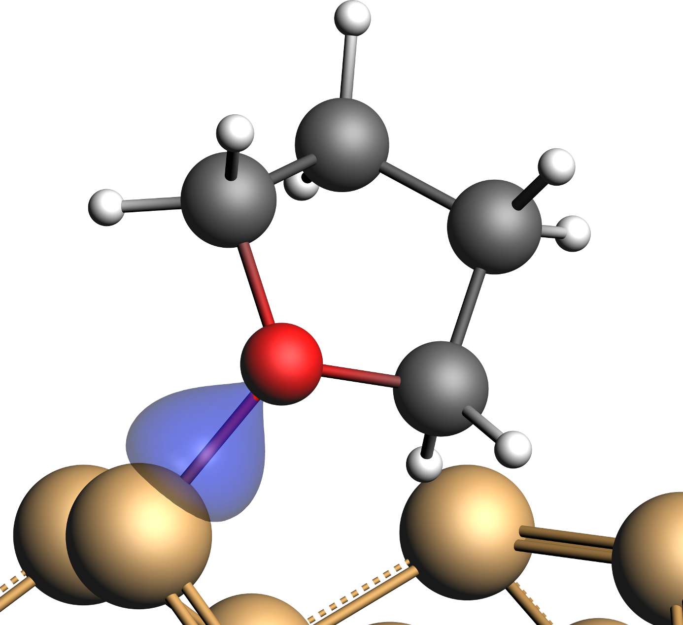 Due to the electrophile nature of Sidown the THF molecule was then added on top of this site with its O-atom oriented towards Sidown. Afterwards, the resulting adsorption complex was relaxed to yield the structure provided for this tutorial.