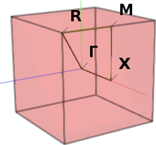 Next we define a specific path through the Brillouin zone along which we want to sample the band structure: From the center Γ we move first to the center X of a facet of the cubic Brillouin zone, then to M in the middle of one of its vertices, then to the corner R to finally return to Γ.