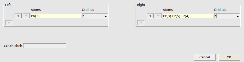 We repeat the above steps also for the combinations Pbs/Brp, Pbp/Brs, and Pbp/Brp. When reopening the COOP window, the previously selected atoms and orbitals are remembered, so you typically only need to adjust the orbital selection: