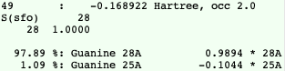 If you move the mouse over a level (orbital) of the Guanine-Cytosine DNA base pair one can find out more detailed information about the composition of the level in terms of the fragment orbitals (FOs). One can conclude that the HOMO of Guanine-Cytosine is almost purely on Guanine, whereas the LUMO is almost purely on Cytosine.