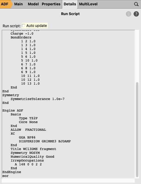 The symmetry has been adjusted to NOSYM. However, we want to use symmetry. Besides setting the symmetry to AUTO, in this case we also need to symmetrize the coordinates again, since using fragments will lower the symmetry of ethane that ADF can use from D3d to C3v. Note that in this case the symmetrization will only reorient the geometry in order to fulfill the molecular orientation requirements in ADF such that ADF can use symmetry.