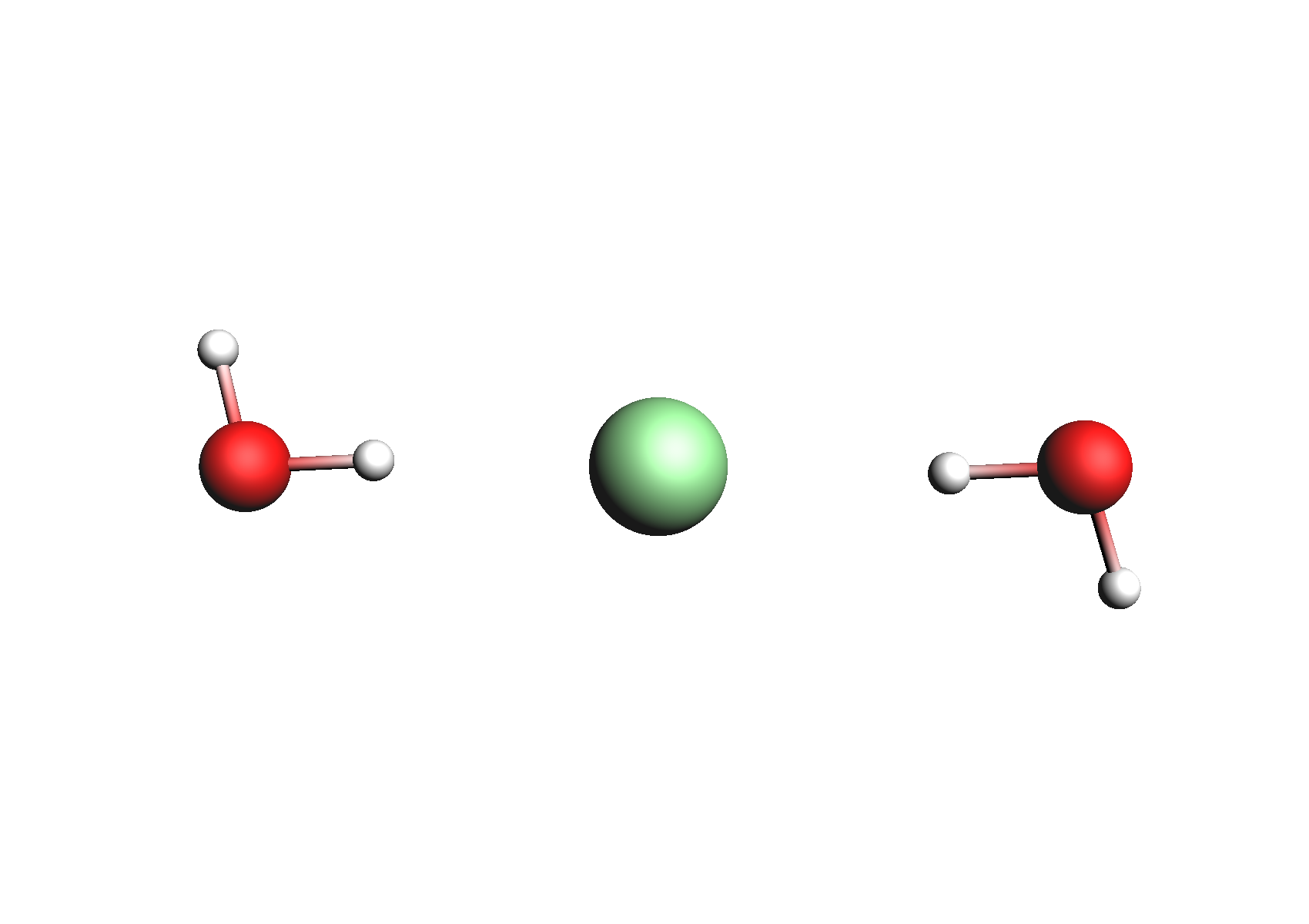 First, we need to do a series of calculations to generate .coskf files for the Na+ and Cl- ions with various degrees of hydration. The geometries of these structures are shown below: