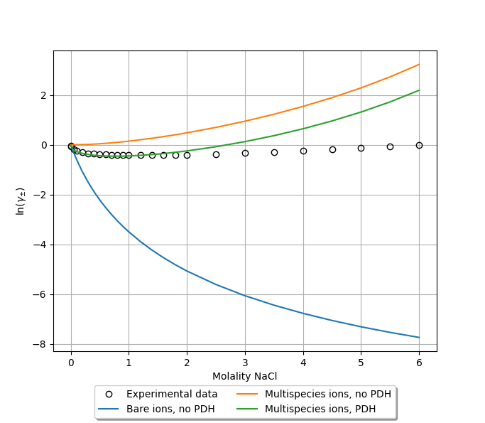 Mean ionic activity coefficients can be calculated with the exact same procedure as above. This results in a much better correspondence to experiment [2], though the results seem to show the wrong trend.