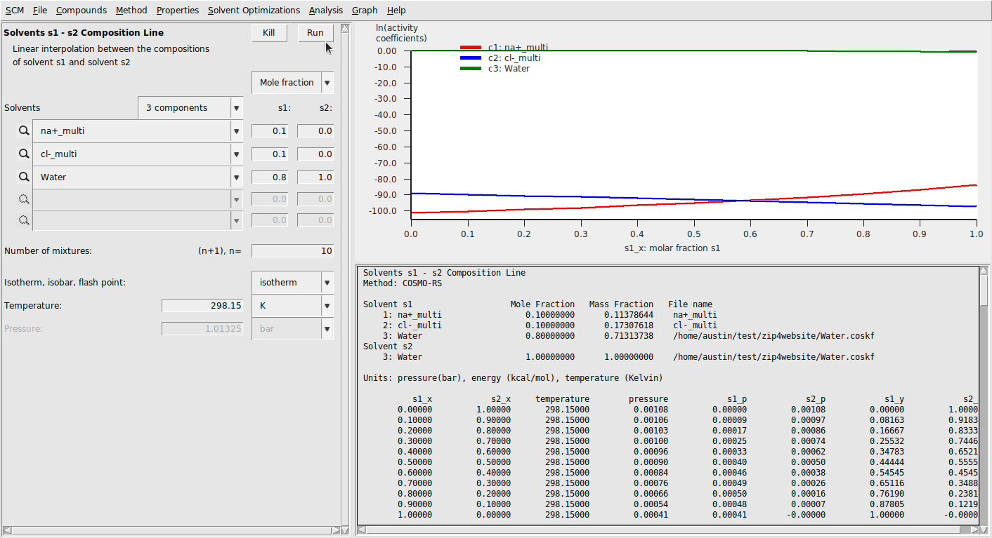We’ll first consider the simple case of dissociated Na+ and Cl- ions in water. To set up this experiment, first generate COSMO Result Files for Na+, Cl-, and Water (or simply use the water .coskf file in the database). Then setup a s1-s2 composition line calculation with the following: