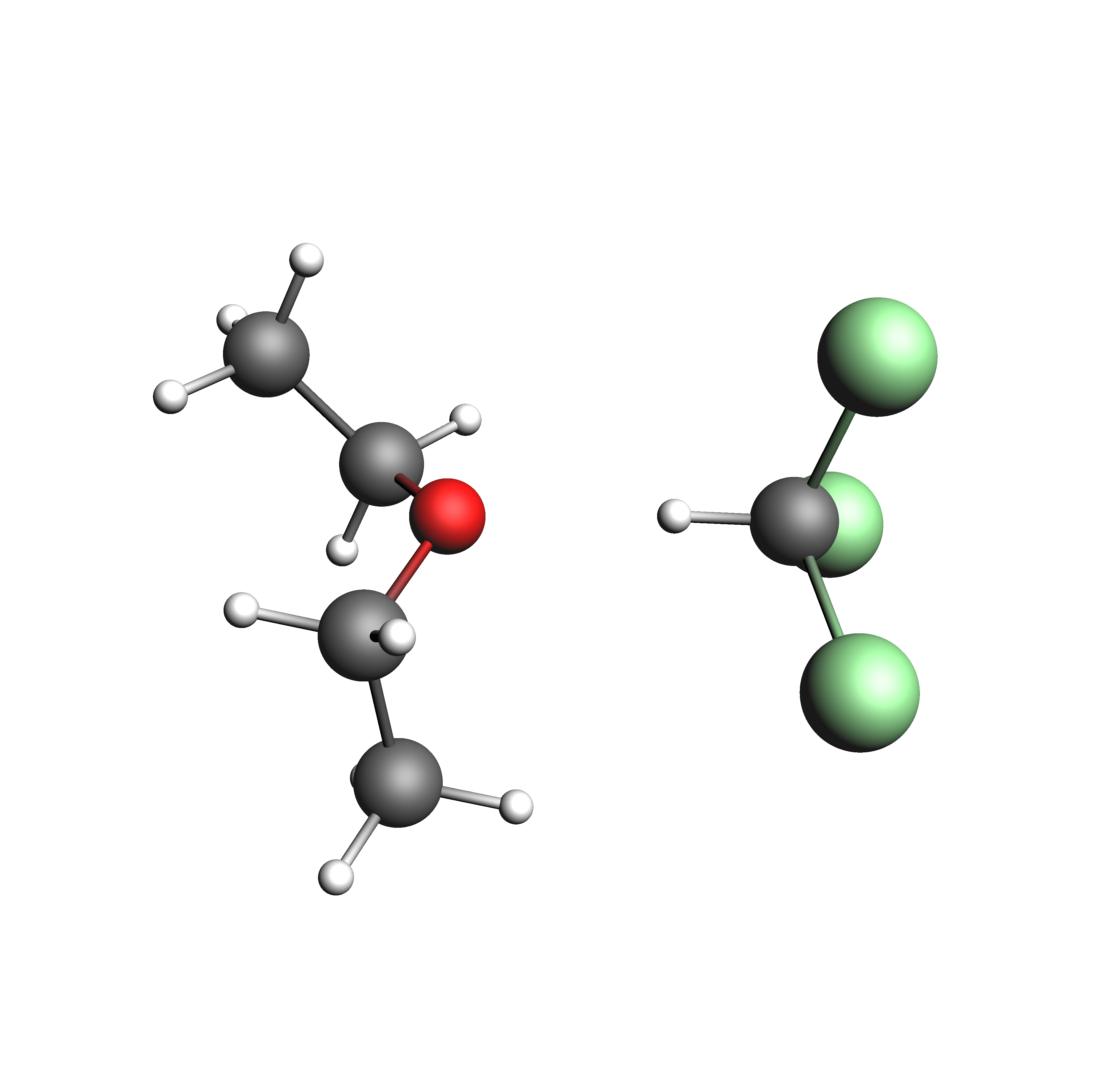 Structures used in the diethyl ether chloroform system: diethyl ether, chloroform, and the associated complex (clockwise from top left)