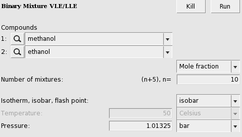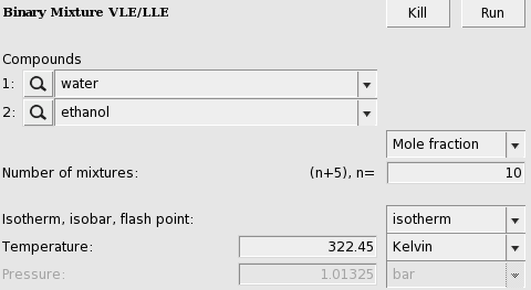 A phase diagram of a mixture of two components can be calculated with Properties → Binary Mixture VLE/LLE. The binary mixture will be calculated for a list of molar fractions between zero and one. This can be done at constant temperature (isothermal) or at constant vapor pressure (isobaric).