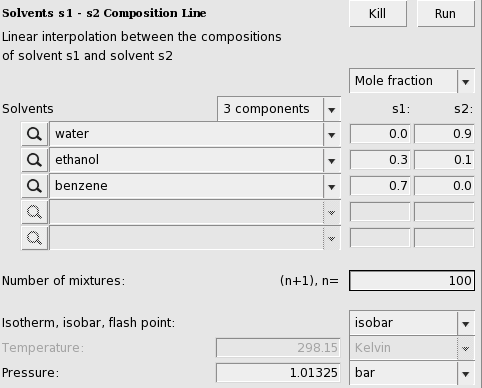 A phase diagram of a mixture of two solvents, which both could be mixtures, can be calculated with Properties → Solvents s1 - s2 Composition Line. The mixture will be calculated for a list of molar (or mass) fractions of the solvents between zero and one, and the compositions of solvent 1 and solvent 2 are linearly interpolated. This can be done at constant temperature (isothermal) or at constant vapor pressure (isobaric).