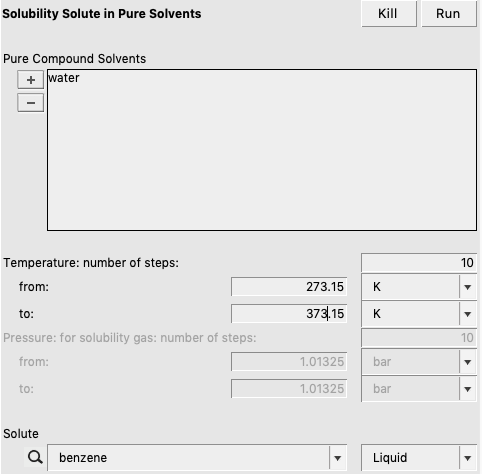 The solubility of a solute in a solvent can be calculated with Properties → Solubility in Pure Solvents or Properties → Solubility in Mixture. The solute can either be a liquid, solid, or gas.