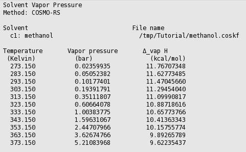 In this case COSMO-RS predicts a vapor pressure of about 0.61 bar (around 455 Torr) at 323.15 K (50.0 °C) for the pure liquid methanol.