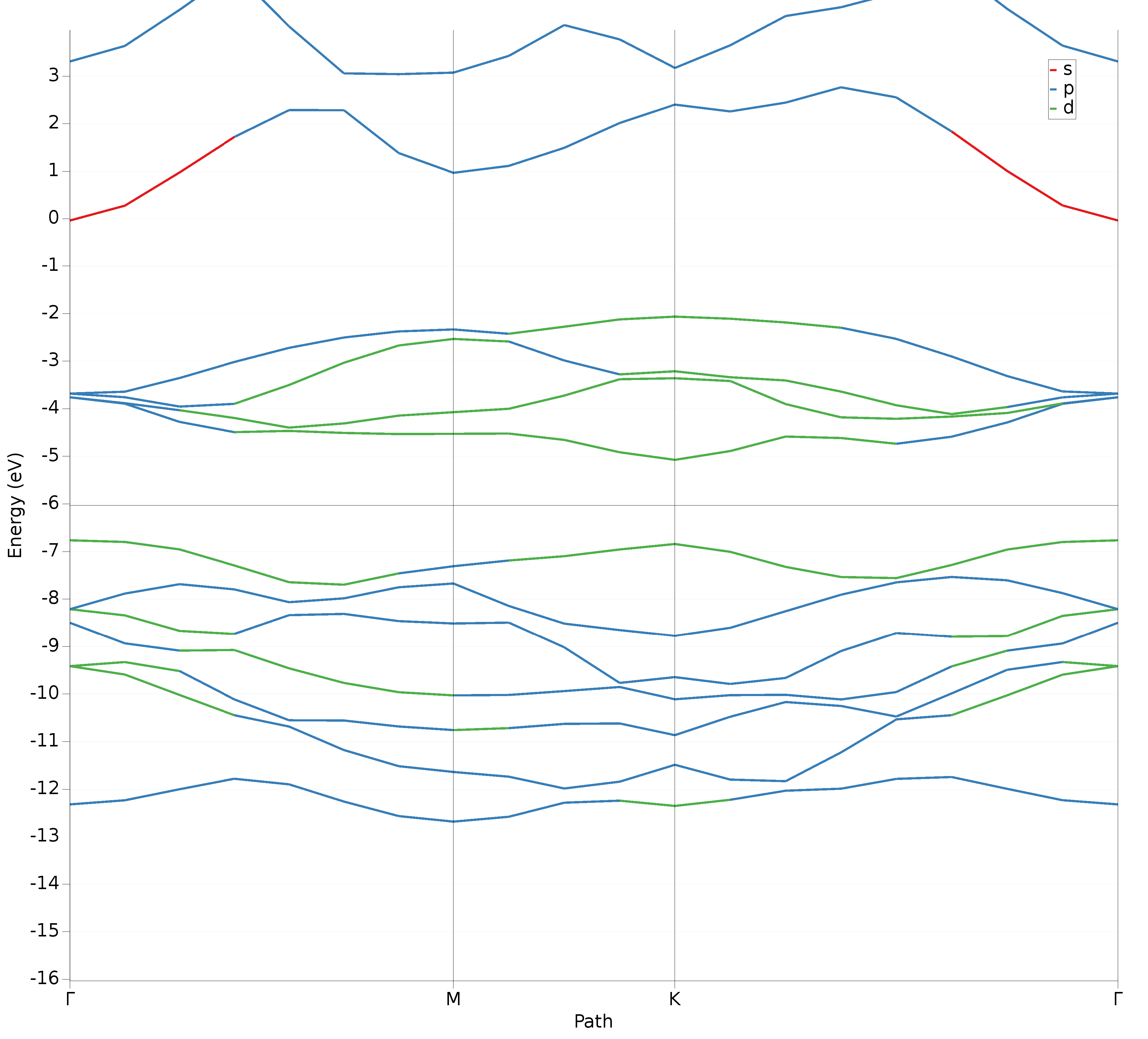 The bands are colored according to the main contribution, also known as ‘fat band analysis’. The band structure will look as follows: