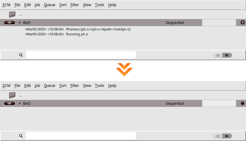 When you run a calculation, AMSjobs should come to the forefront, and your job will appear at the top of the list. On the right side, you’ll see the job running, indicated by a gear icon. While the simulation is in progress, the AMSjobs window will display the progress based on the logfile. Once the job is complete, the job status icon will change to a full circle to indicate that it is ready.