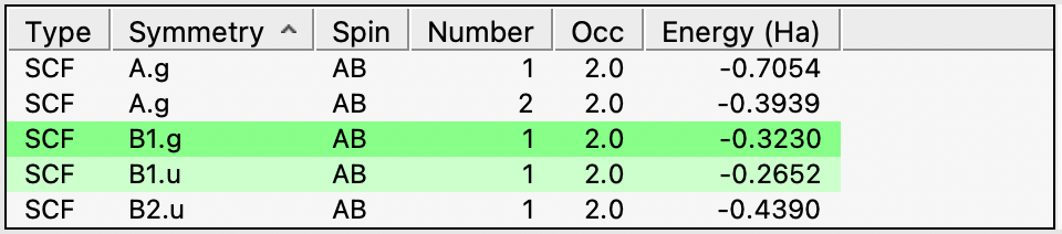 In the orbital table you can select the orbital that you want to see. Note that the currently visible orbital is highlighted using a dark green background.