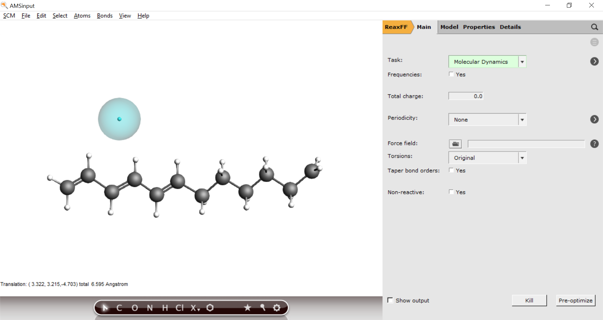 In this tutorial, eReaxFF is used to simulate the dynamics of an electron transferring through a hydrocarbon radical. A detailed description of the eReaxFF method and the carbanion (explicit electron + hydrocarbon radical) are given in: