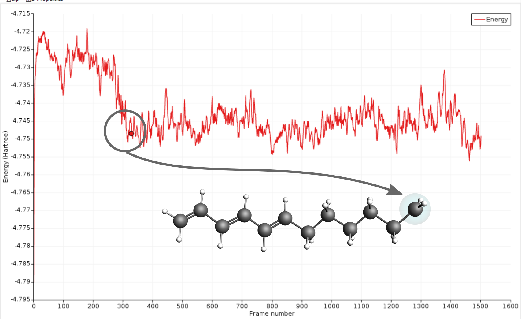 A more quantitative analysis can be carried out by comparing transfer rates at different temperatures and/or calculating a time averaged position of the electron along the atoms of the chain. The transfer times can simply be extracted from the movies of different trajectories, while the calculation of averaged positions is easily done with the help of the PLAMS python library shipped with AMS