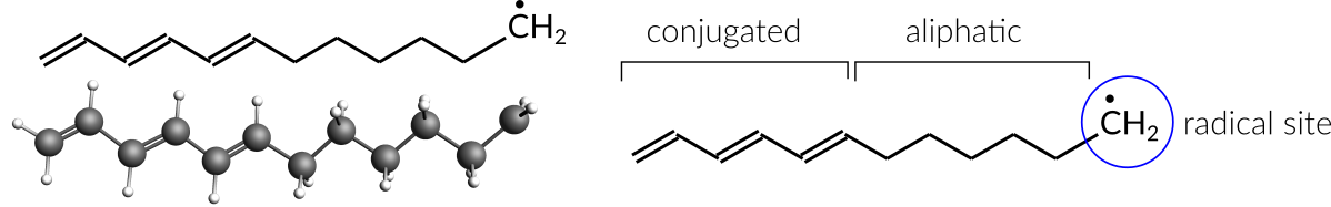 The hydrocarbon radical C12H19• is the base used to construct an anion with one explicit electron. This radical consists of both a conjugated (polyacetylene) and an aliphatic part. In addition, a radical site has been placed on the end of the aliphatic part (labeled CH2in the below image).