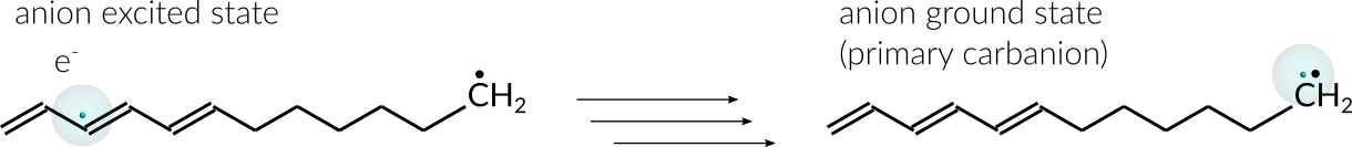 An excited anion is generated by inserting one explicit electron into the conjugated part of the radical. From there the electron can diffuse through the chain until eventually settling at the radical site. Once the electron settles at the radical site, the ground state of the anion, a primary carbanion, is reached.