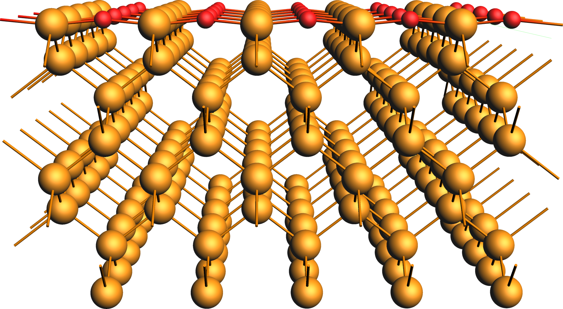 After converting the crystal to a surface slab model, the oxygen centers were added to the surface and relaxed in the following.