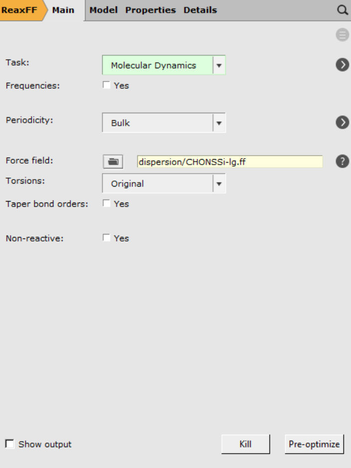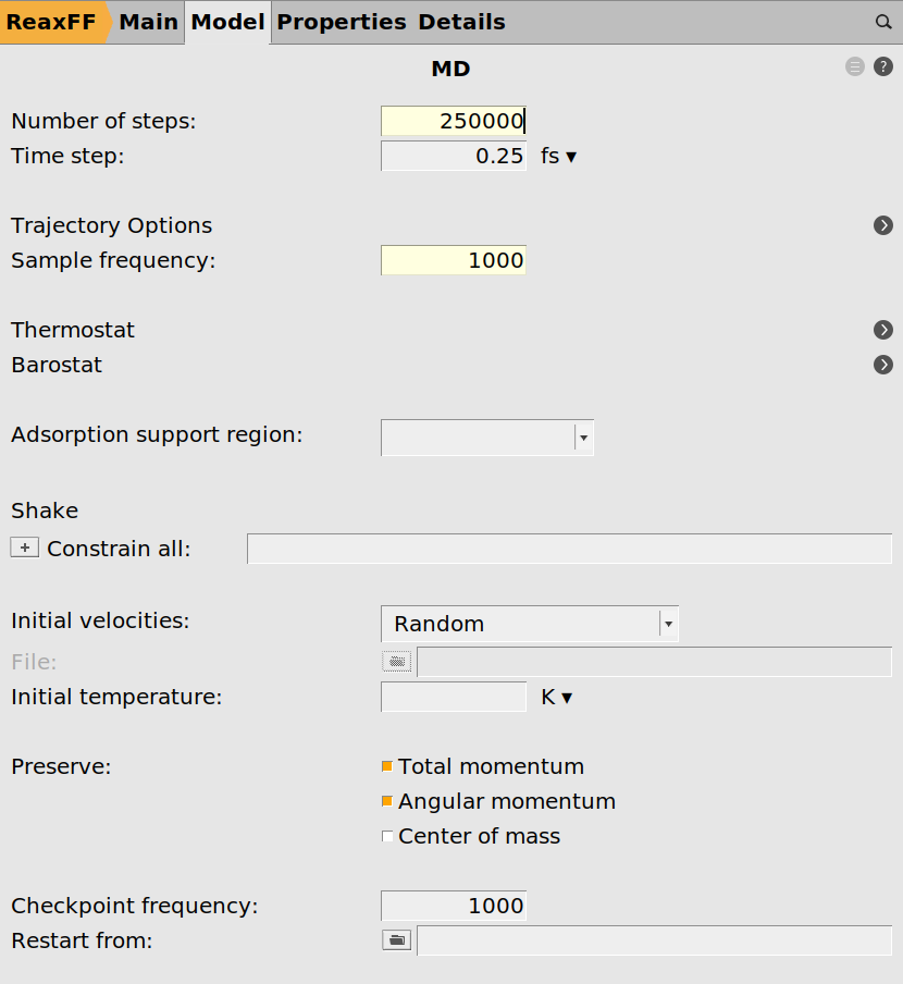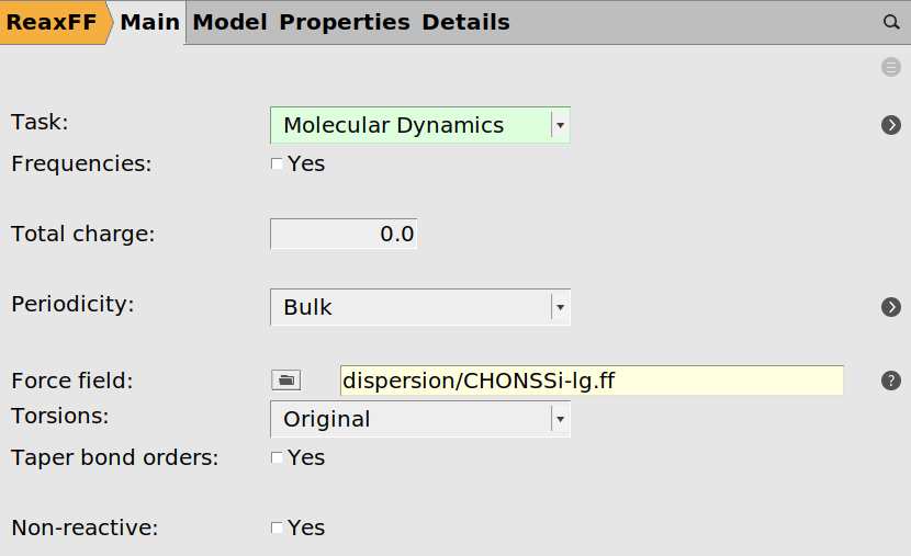 After completing the setup of the bond boost in the previous chapter, we can test the boost by running a small NVT trajectory. Choose the following general ReaxFF settings from the main panel
