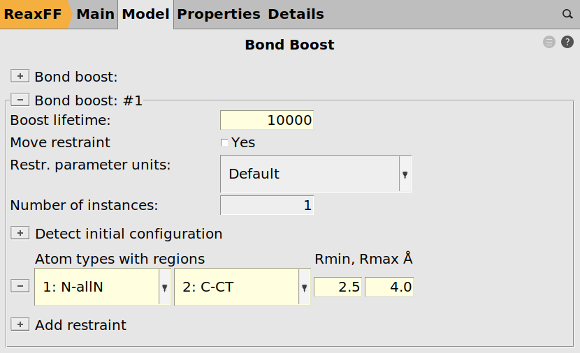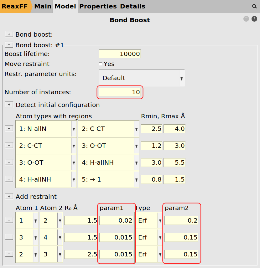 Next we can assign the tracking for the bond boost using the same logic as before with the exception of requesting more bond boost instances and softer restraints. The instances refer to the number of simultaneously boosted reactions. Since we have ten amines, i.e. ten reaction sites, we could in principle expect ten simultaneous reactions (not counting double reactions on the same amine group). The restraints are softened to prevent the molecules from tearing apart when multiple boosts are active at the same time.