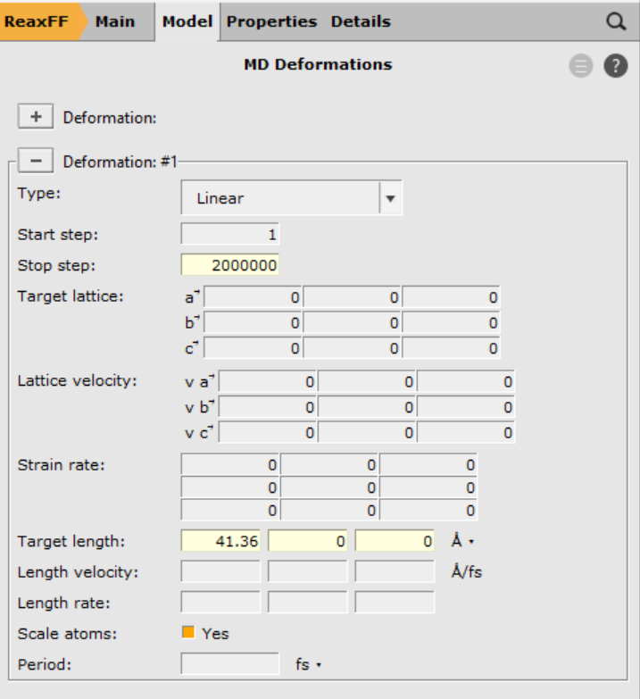 The length of the a-lattice vector a (\(\mid\vec{a}\mid\)) is found to be 37.59793 Å. The endpoint, after stretching it 10%, will then be 41.36 Å. To define this strain, change to the MD deformation panel