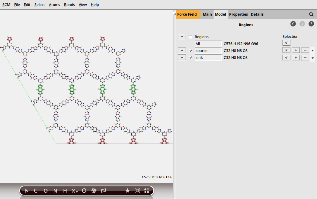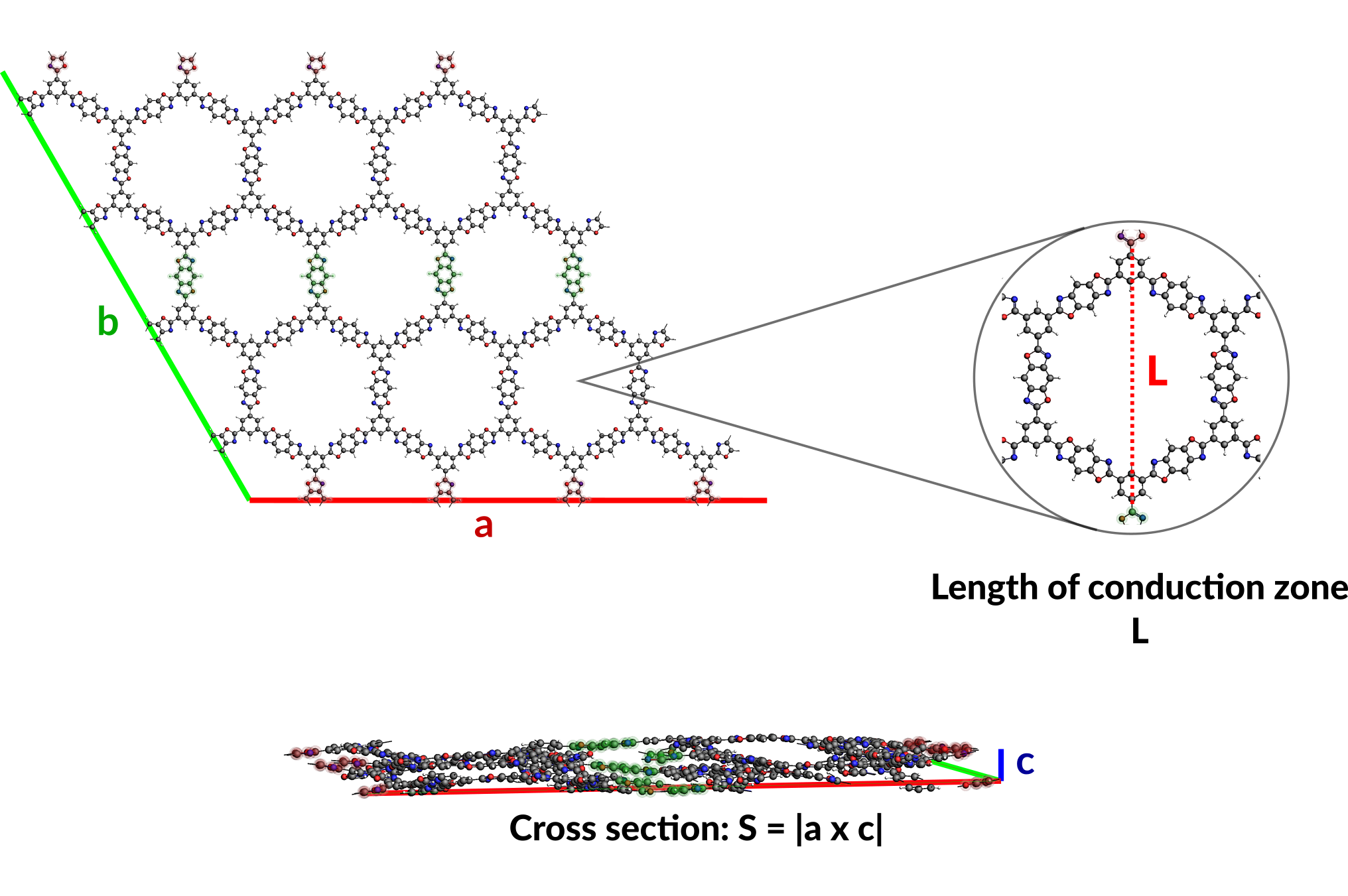 A heat flow is realized by running two local thermostats, heat source and heat sink, inside the same molecular structure. The heat source is set to be 10K above the target temperature, while the heat sink is kept 10K below the target temperature. From the energy collected at the heat sink over time and the cross-sectional area, the heat flux and thermal conductivity can be calculated. Both the molecular structure and the workflow were taken from the combined experimental and theoretical study E.M. Moscarello, B.L. Wooten, H. Sajid, L.D. Tichenor, J.P. Heremans, M.A. Addicoat, P.L. McGrier, ACS Appl. Nano Mater. 2022, 5, 10, 13787–13793.