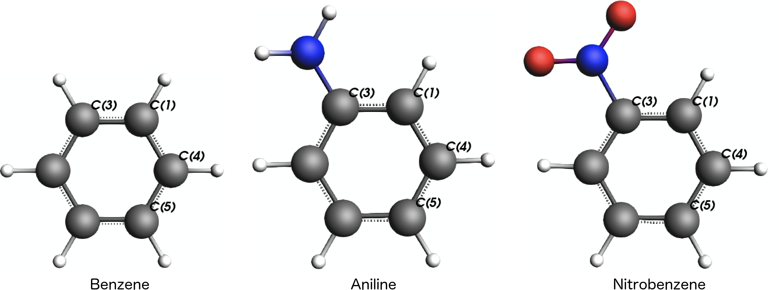 The main idea is now to compute the NMR shielding parameters for three different carbon atoms in the ring, C(1), C(4), and C(5), which are in ortho-, meta-, and para-position to the substituent at atom C(3):
