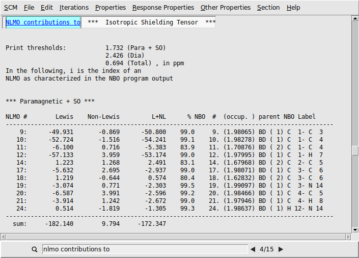 We first look at the individual NLMO contributions to the isotropic shielding tensors. Each output file contains the NLMO and NBO decomposition of the isotropic shielding tensors (and other quantities) for the atoms C(1), C(4), and C(5).