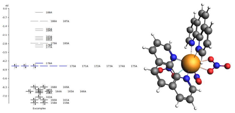 [Eu(NO3)3(phenanthroline)2] has an open-shell electronic structure, where the Eu 4f orbitals are occupied with 6 valence electrons. In accord with the LFDFT method we have to define an average of configuration type calculation. We use the keyword “IRREPOCCUPATIONS” in ADF to set fractional electron occupations of the molecular orbitals. For [Eu(NO3)3(phenanthroline)2], 338 electrons are restricted to closed shell, and 6 valence electrons are evenly distributed over the seven molecular orbitals that are identified with large atomic 4f characters and thus constitute the active subspace of the ligand-field calculation.