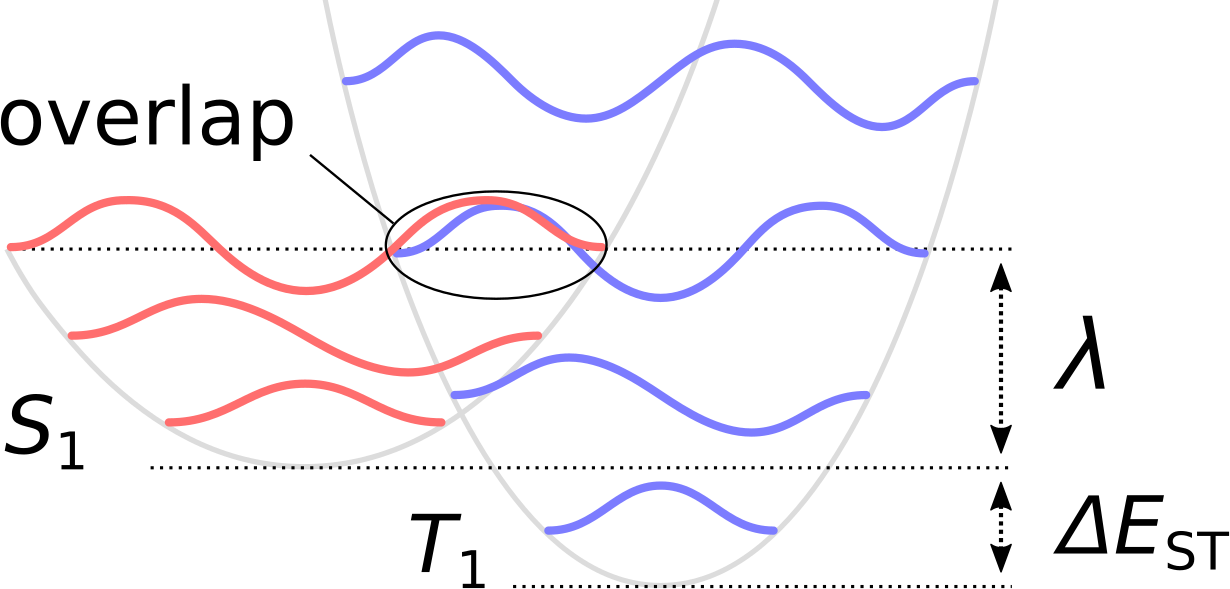 Fig. 43 The Franck-Condon principle describes \(T_{\mathrm{1}}\rightarrow S_{\mathrm{1}}\) transition rate in terms of the overlap between the nuclear vibronic wavefunctions of the initial and final state, respectively.¶