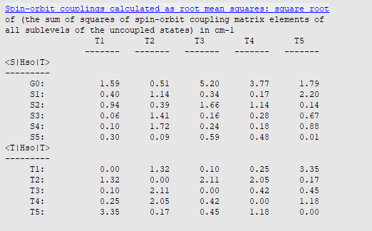 The above root mean square coupling element \(|\langle S_{\mathrm{1}}|\hat{H}_{\mathrm{SOC}}|T_{\mathrm{1}}\rangle|\) is then divided by three to represent the average over the three triplet states (see above). From the \(|\langle S_{\mathrm{1}}|\hat{H}_{\mathrm{SOC}}|T_{\mathrm{1}}\rangle|\) value of 0.4 cm-1 we then obtain \(|V_{\mathrm{SOC}}|^{2} =\) (0.4 cm-1)2 / 3 = 8.2\(\cdot\)10-10 eV2.
