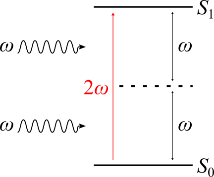 Fig. 44 Schematics of the levels involved in a two photon absorption (TPA) process exciting an absorbing system from its ground state \(S_{0}\) to an excited state \(S_{1}\).¶
