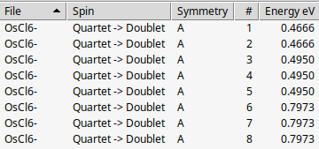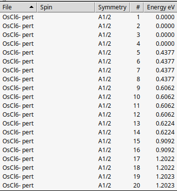The octahedral OsCl6- was investigated in Ref. [2] which has a 4A2g (quartet) ground state, and low 2Eg, 2T1g, and 2T2g (doublet) excited states, all having a high Os 5d3 character. The states are split by SOC into the 0 \(\Gamma_{8g}\), 1 \(\Gamma_{8g}\), 2 \(\Gamma_{8g}\), 1 \(\Gamma_{6g}\), 1 \(\Gamma_{7g}\), and 3 \(\Gamma_{8g}\) states.