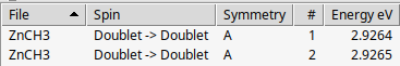 ZnCH3 was investigated in Ref. [1] which has a 2A1 (doublet) ground state and a lowest 2E excited state. The SOC splitting of 2E state into a 2E1/2 and a 2E3/2 state was calculated. In the ground state as well as in the lowest excited state the unpaired electron is mostly located at the Zn atom. The hybrid functional BHandH is used with a QZ4P basis set on the Zn atom and a TZ2P basis set on the other atoms.