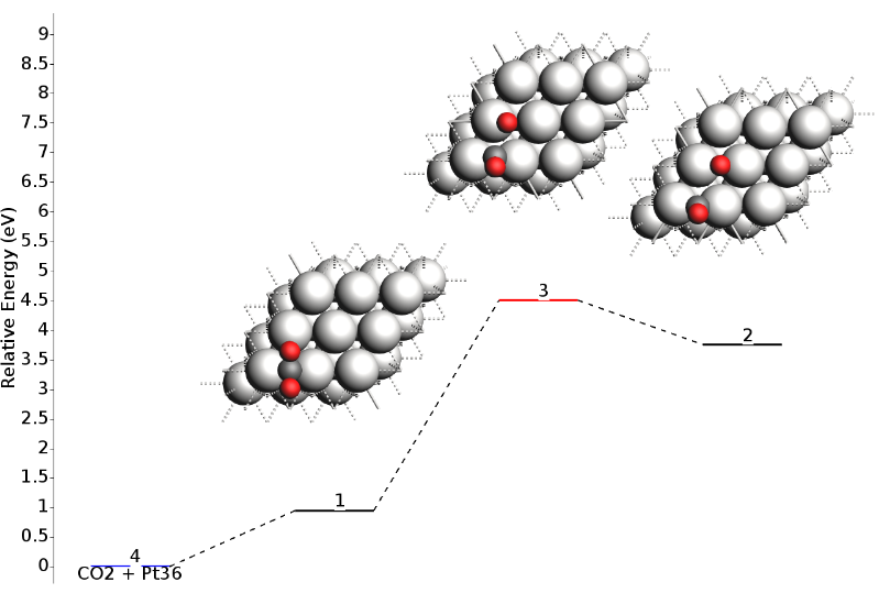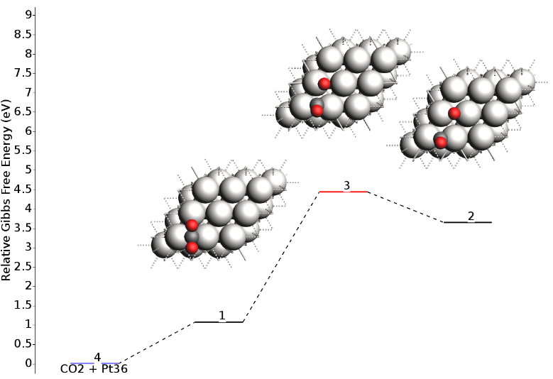 Adsorption: \(\text{CO}_2\) from the gas phase adsorbs onto the Pt(111) surface. We refer to this adsorbed state as the reactant.