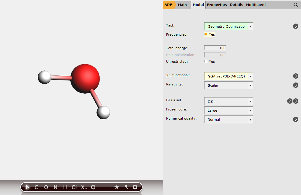 Run the job and repeat for H2O and OH by changing the structure of the molecule. For the OH calculation, please note that OH is a radical (doublet) species and you should ensure that you select the Unrestricted checkbox in the Main panel and enter 1 in the Spin polarization field.