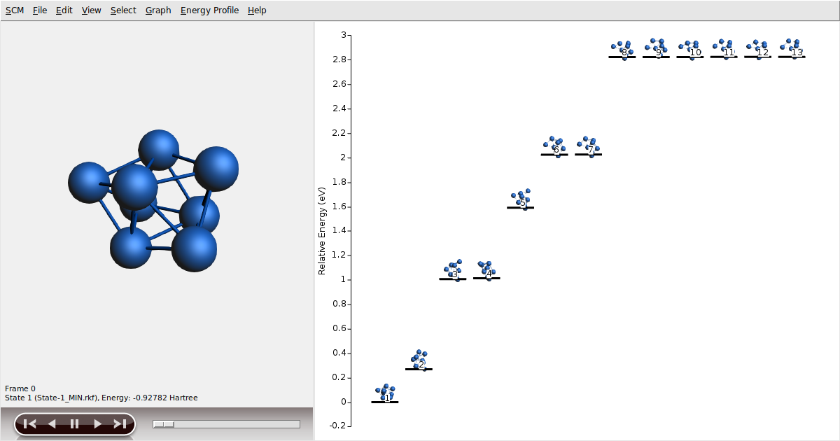 As a final comment, due to the stochastic nature of the algorithm and/or differences in numerical precision, you can get different results for the energy landscape exploration. In our example, particularly, we have chosen 100 for Num expeditions to guarantee that you can get the full set of critical points; 12 local minima and 12 transition states.