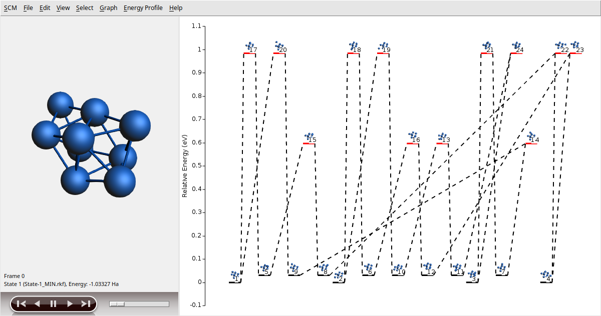 You should get a graphical representation of the states discovered during the searching in the right panel. Minima are shown with a black level, while transition states are shown using a red level. You can move around the different states by clicking on them. The selected state is shown on the left panel to appreciate details.