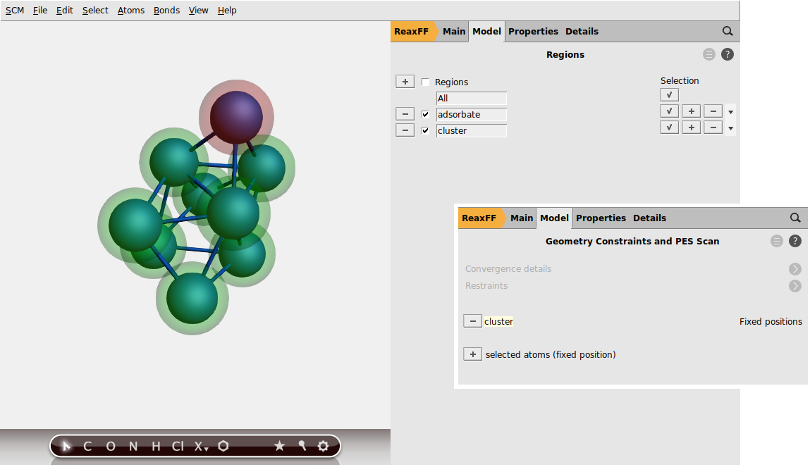 First, we would like to define two regions: 1) adsorbate, corresponding to the added atom, and 2) cluster, corresponding to the Co8 global minimum. Then, we use the defined cluster region to fix the coordinates of the Co8.