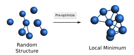 We need an initial guess for the structure of the Co8 cluster. Thus, create a random structure composed of 8 atoms of Co by using the drawing tools of AMSinput. Avoid a planar configuration for the cluster’s atoms; to do so, take some atoms out of that plane individually if needed. The difficulty is that planar configurations usually converge to a transition state during optimization instead of a local minimum. Then, use the Pre-optimize button on the main panel to get the closest local minimum, make sure to pre-optimize the full structure. Make sure that you have a non-flat structure with none of the atoms collapsed. Otherwise try rebuilding an 8-atom cluster again. This step is summarized in the following Figure:
