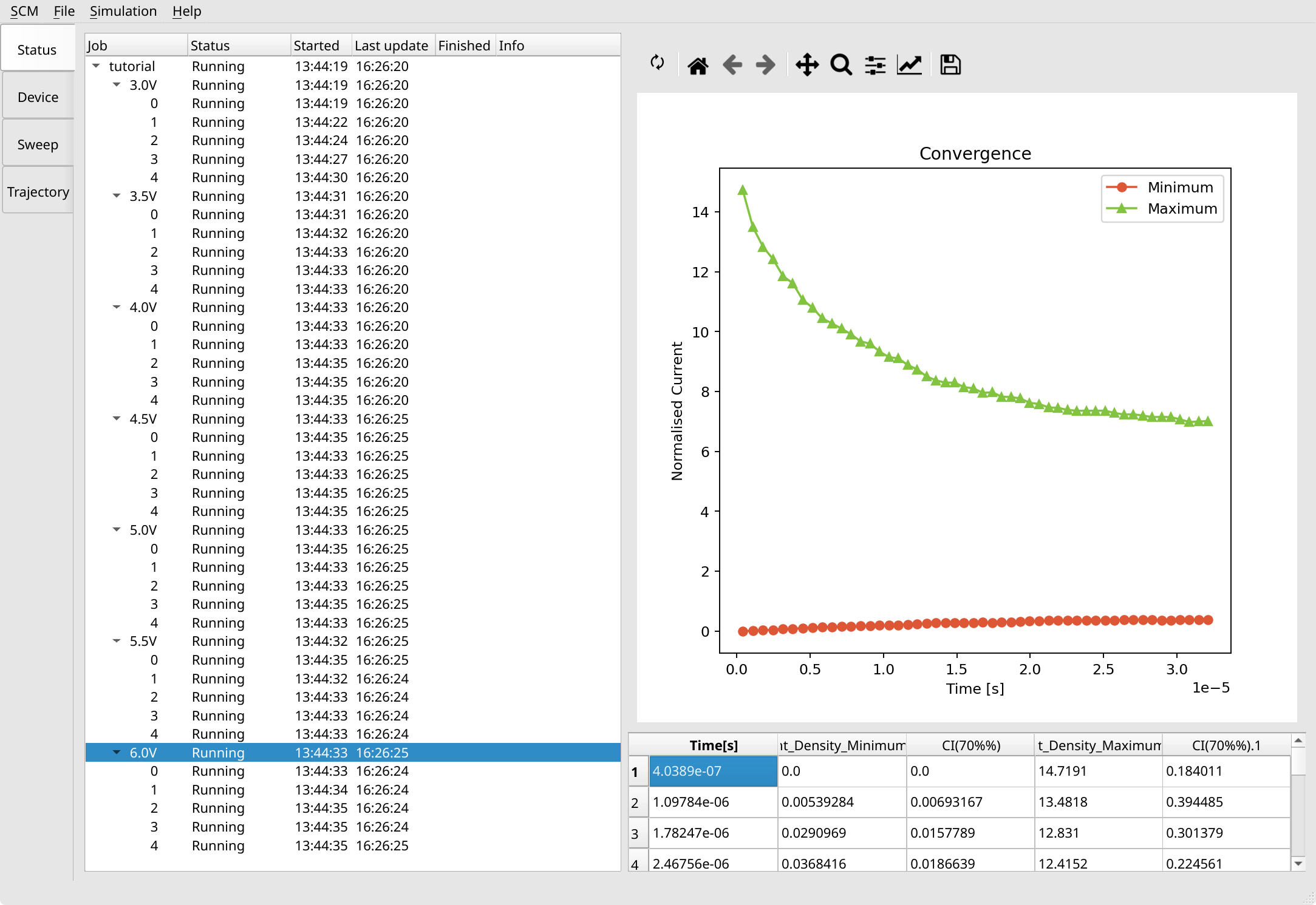You will notice that calculations at higher voltages are faster to converge. Once convergence is reached, sweep points (and also individual trajectories) can be stopped by right clicking them and selecting Request stop, or via the Simulation menu entry at the top.