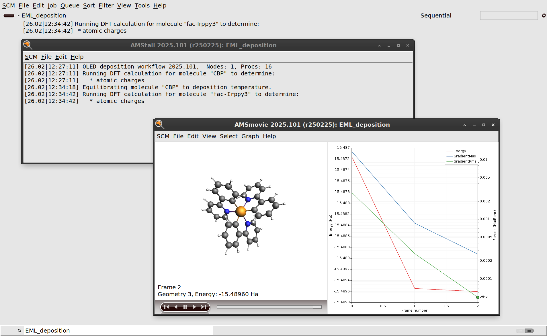 EML_deposition.The first step in the deposition workflow is a DFT geometry optimization of CBP and Ir(ppy)3. This is done to determine the atomic charges that will be used for modeling the electrostatics with the force field. See the OLED workflows manual for more information.